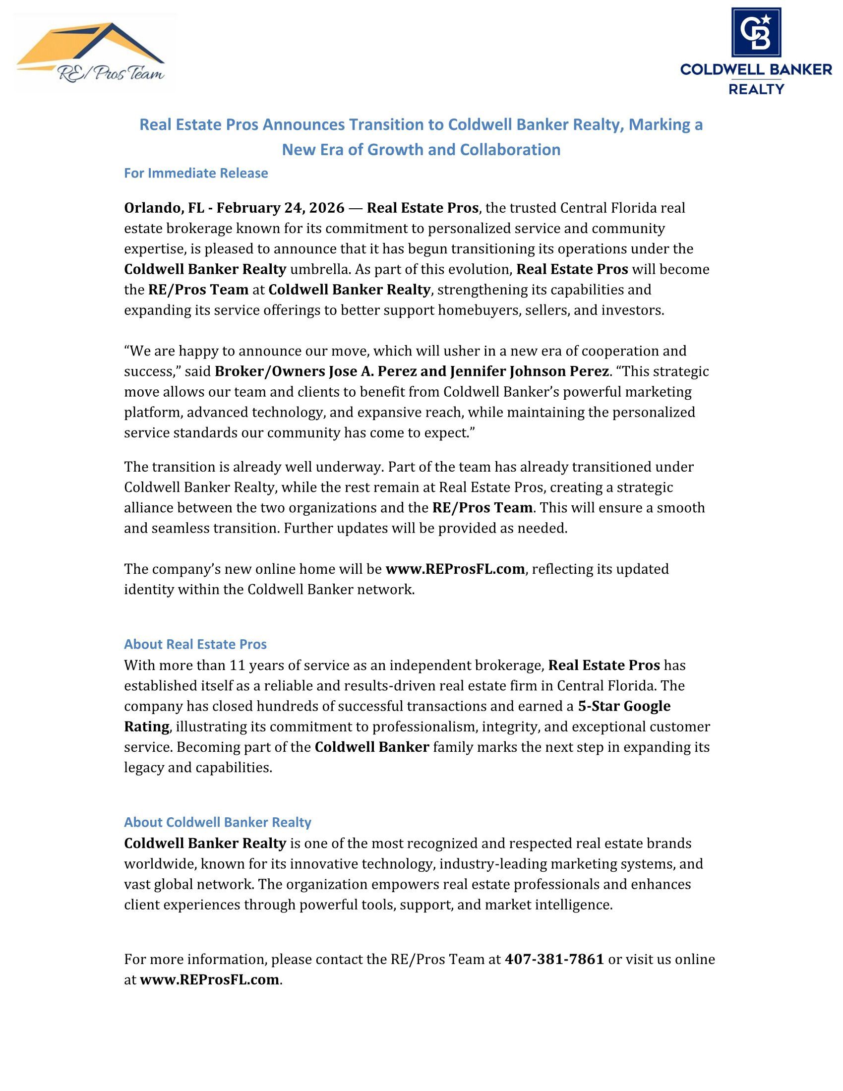 Real Estate Pros Announces Transition to Coldwell Banker Realty, Marking a New Era of Growth and Collaboration
